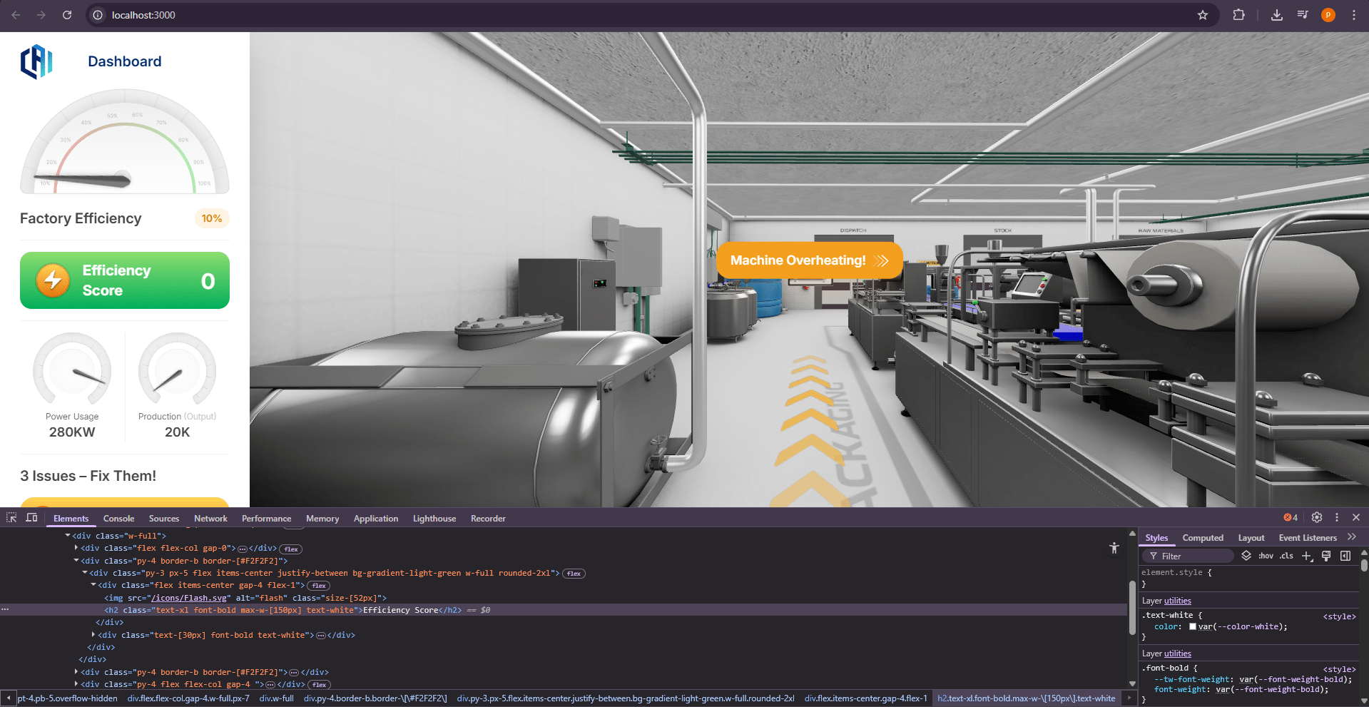 Players started at the factory dashboard, spotted active alerts, entered the 3D environment, fixed issues with simple taps/swipes, and finally saw their final score.